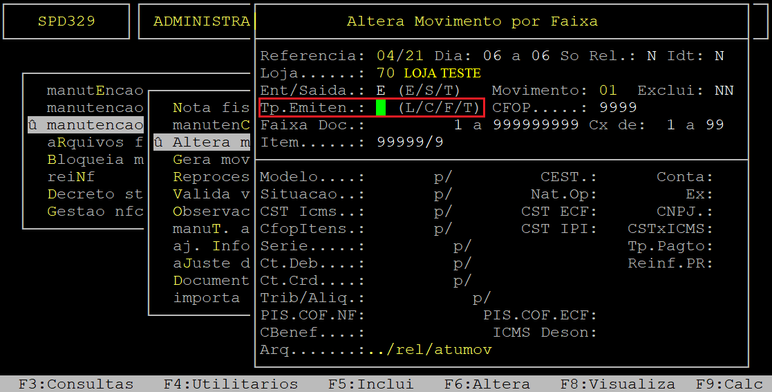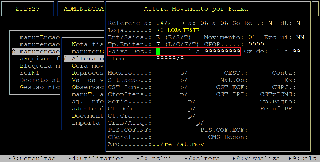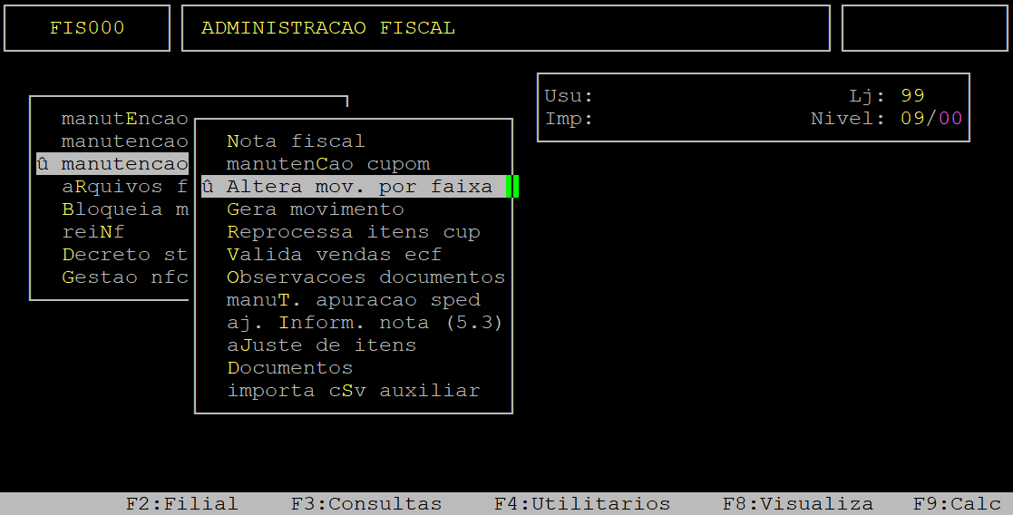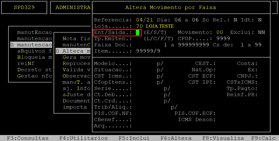 Localização: | Administracao Fiscal / Manutencao Sped / Altera mov. por faixa |