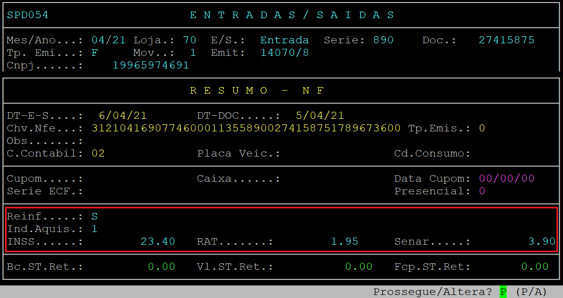 Assim que carregar os dados da nota fiscal, aperte a tecla Enter duas vezes para visualizar os dados do REINF.