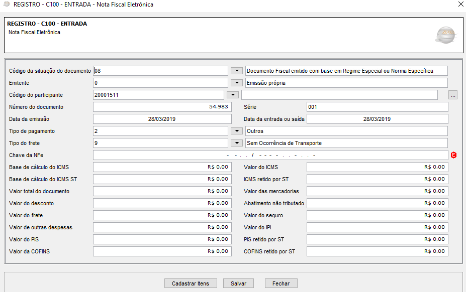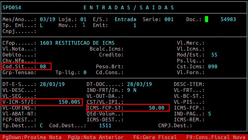 Abaixo segue o exemplo da tela da gravação da nota fiscal, do exemplo anterior, no Registro C100, referente a emissão da Nota Fiscal de Restituição de ICMS ST.