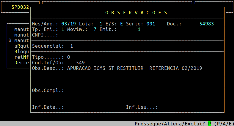Localização: | Administracao Fiscal / Manutencao Sped / Observacoes Documentos |