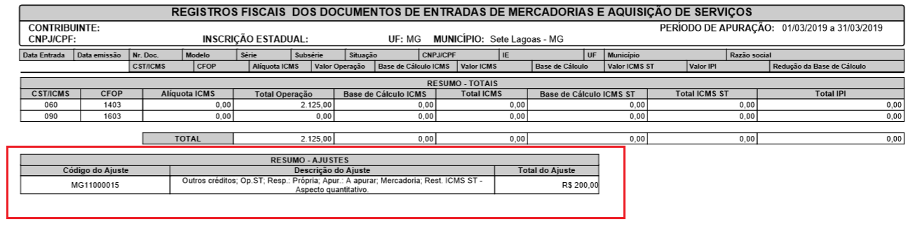 O contribuinte emitirá, ao final do período de referência, a NF-e em seu próprio nome, no qual deverá conter nos campos próprios as seguintes indicações: com o CFOP 5.949 deverá conter " Complemento De ICMS ST ", e com o CFOP 1603 deverá conter " Aspecto quantitativo ". O contribuinte de Minas Gerais (MG) deve lançar os dados da NF-e no registro C100 e demais registros filhos exigidos pela legislação e complementar o lançamento com os registros C195 e C197, sendo refletidos no Bloco E210-Apuração do ICMS ST.