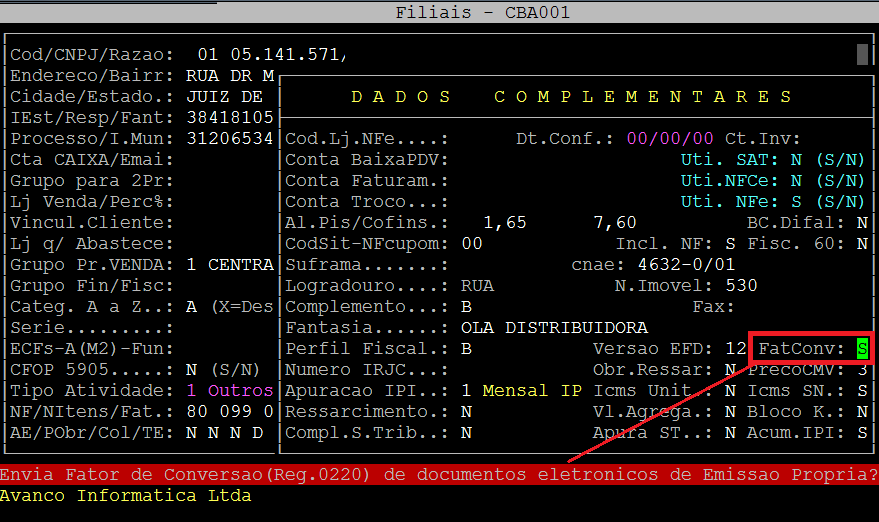 Acesse a localização indicada acima para realizar as alterações, a seguir pressione Enter até a tela de Dados Complementares e no campo "FatConv" informe a letra "S" caso deseje enviar o fator de conversão no Registro 0220 referente aos documentos de emissão própria.