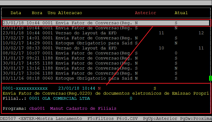 Acesse a localização indicada acima para realizar a conferência do log das alterações. Nessa rotina visualize as alterações de definição de parâmetros realizada pelos usuários.