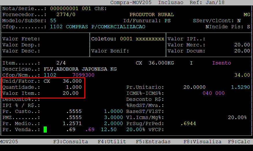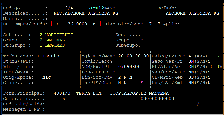 Na emissão da Nota Fiscal observe que o item digitado possui o fator de conversão em caixa, CX - 36 Kg e a quantidade comprada foi de 1 (uma) caixa, totalizando desta forma 36 Kg.
