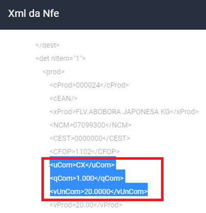 No XML da nota fiscal emitida observe que nas "Tags" (Campos) referente a Unidade de Medida, a tag "<uCom>" foi gravada a Unidade Comercial em "CX" , a tag "<qCom>" com 1 (hum) e a tag "<vUnCom>" com R$ 20,00.