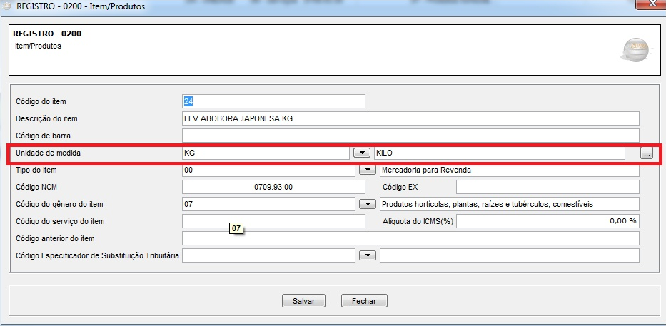 No registro 0200 informe normalmente o produto com a unidade de medida utilizada para o controle de estoque, que no exemplo a seguir será KG - Kilo.