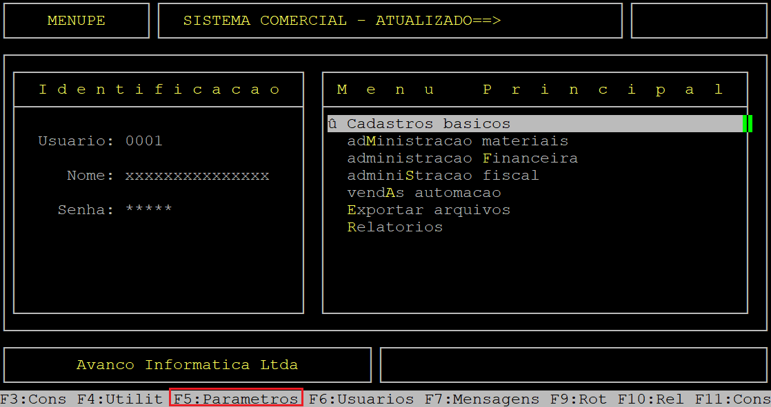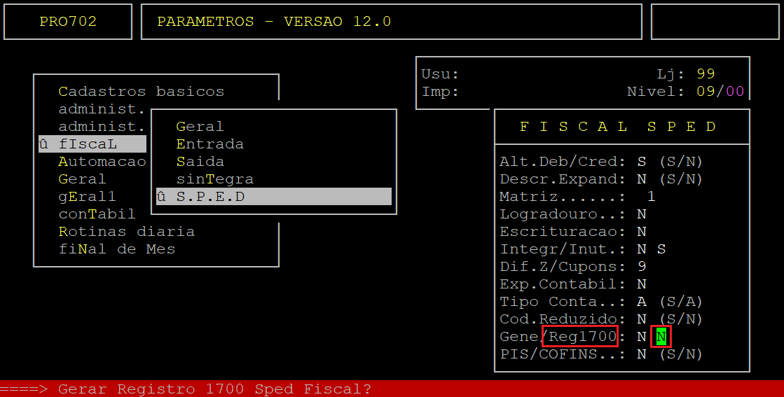 Ao acessar a rotina de Parâmetros, pressione a tecla Enter até alcançar o campo Reg1700, no qual deverá informar a letra S para que gere o Sped Fiscal com o registro 1700 referente aos documentos fiscais utilizados para NFC-e´s emitidas em contingência, ou N para que não gere o registro 1700.