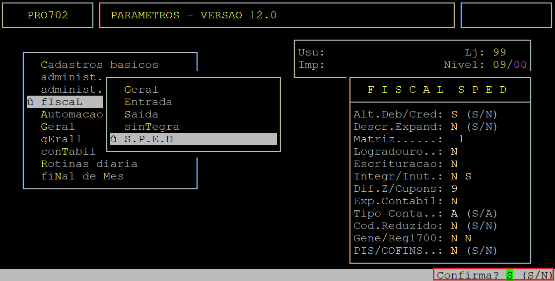 Em seguida, pressione a tecla Enter para percorrer os demais campos até ser exibida a pergunta " Confirma? ", no qual deverá pressionar a tecla Enter ou informar a letra S para confirmar a configuração do parâmetro.