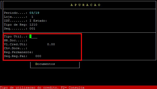 Tipo Util: | Informe o tipo da utilização de crédito, ou pressione a tecla F2 para verificar as opções cadastradas no sistema. |