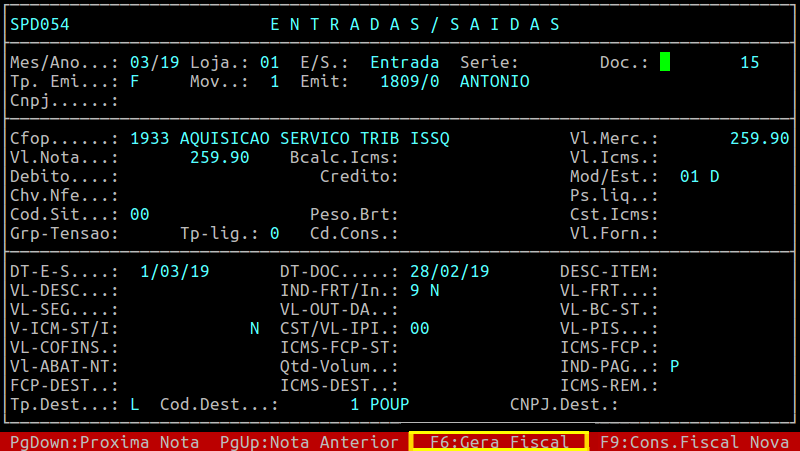 Assim que preencher os campos acima, pressione a tecla Page Down para carregar os dados da nota fiscal. Em seguida, pressione a tecla F6 para regravar a nota na rotina do Fiscal, conforme exemplificado abaixo.