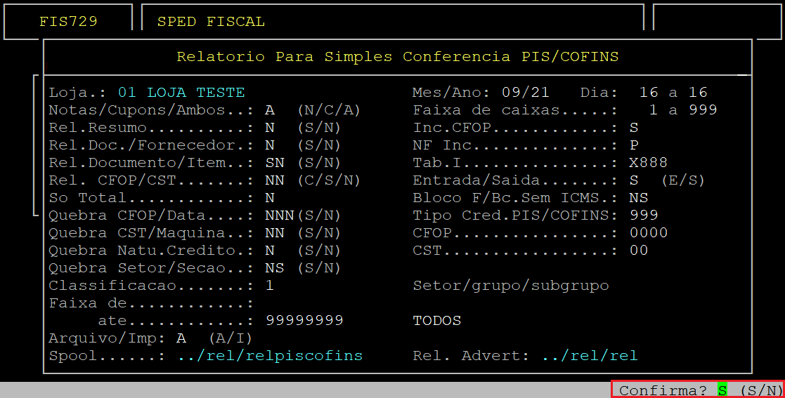 Ao ser exibida a pergunta " Confirma? ", pressione a tecla Enter ou a letra S para confirmar e gerar o relatório.
