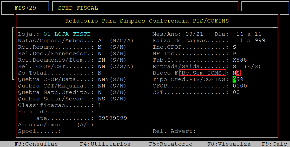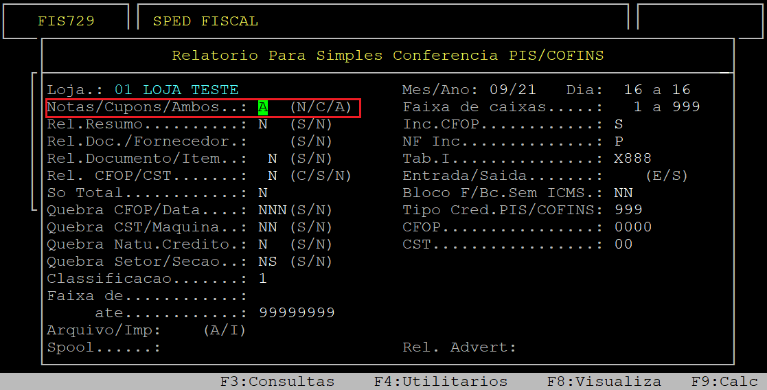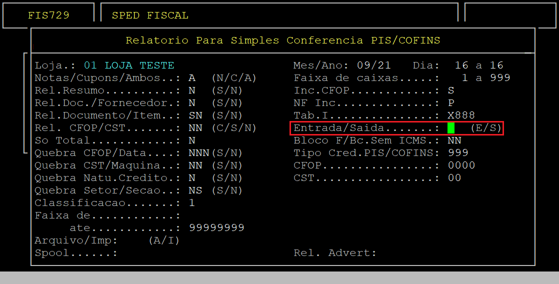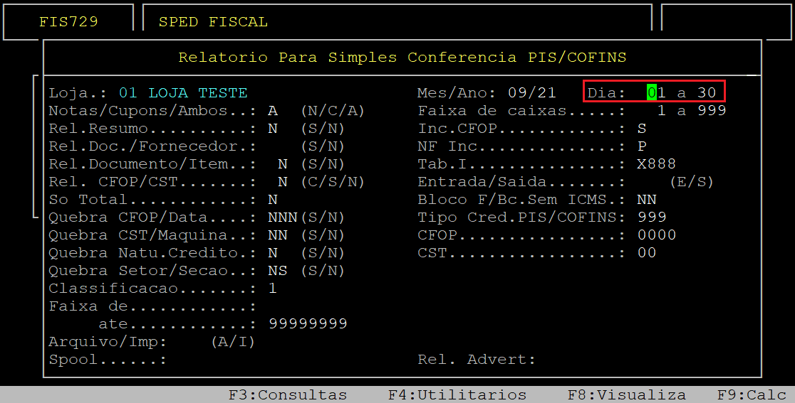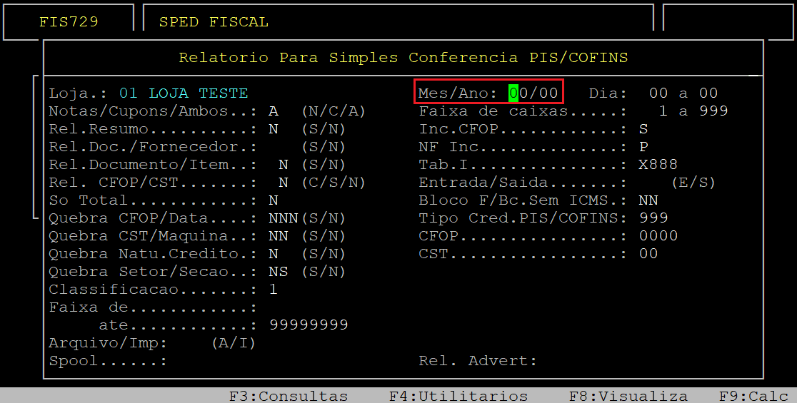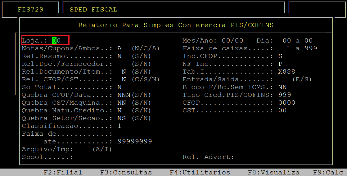 Ao acessar a rotina Relatorio Para Simples Conferencia PIS/COFINS, no campo Loja informe o código da loja (com dois dígitos) que deseja gerar o relatório.