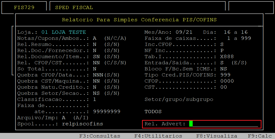 No campo Rel. Advert, informe um nome do arquivo de advertência, para visualizar os erros gerados durante o processo de geração do relatório, se existirem. Em seguida, pressione a tecla Enter para prosseguir.