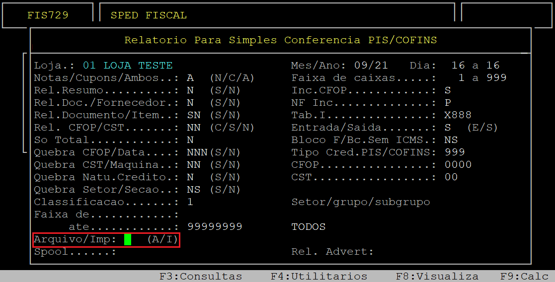 Pressione novamente a tecla Enter até alcançar o campo Arquivo/Imp, no qual deverá informar a letra A para gerar um arquivo.