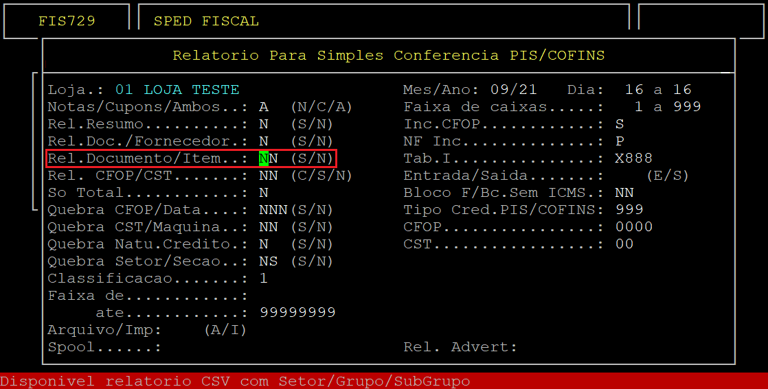 Em seguida, pressione a tecla Enter para percorrer pelos campos até alcançar o campo Rel.Documento/Item, no qual deverá informar a letra S para que o relatório seja separado por documento e seja gerado um arquivo CSV com setor/grupo/subgrupo. No campo Item, informe a letra S para acumular por itens, ou N para não acumular.