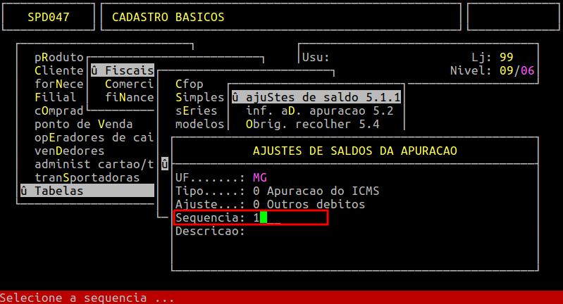 No campo Sequencia, informe o sequencial da identificação do tipo de ajuste.