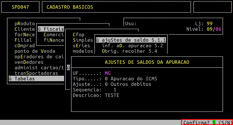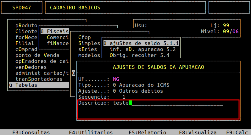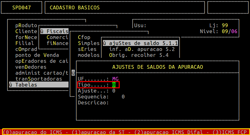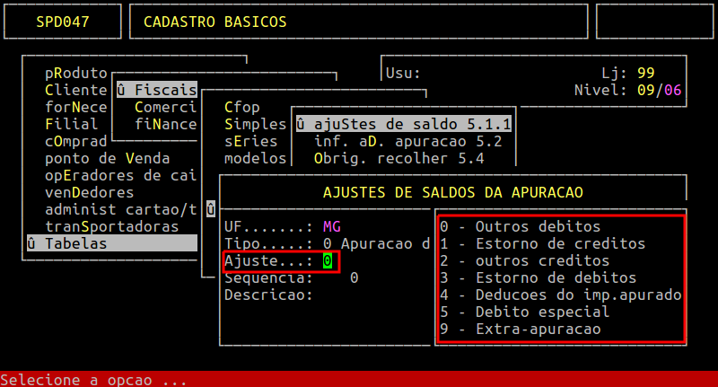 SPED EFD - NFe NFCe / Apuracao / Aj. Saldos (5.1.1) |
