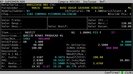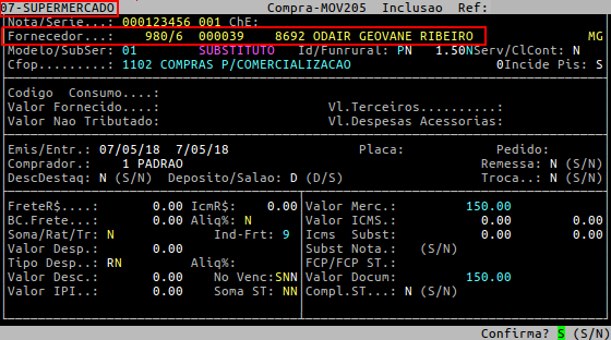 Em seguida, pressione a tecla Enter para percorrer os demais campos. Ao ser exibida a pergunta " Confirma? ", pressione a tecla Enter ou informe a letra S para confirmar a alteração realizada.