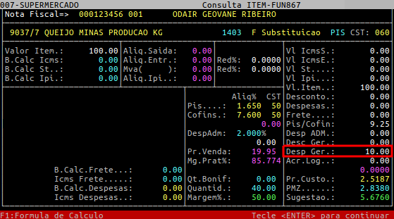 Para consultar o desconto gerencial, que foi concedido de modo automático através do cadastro do fornecedor, pressione a tecla F2 no campo Item e em seguida, a tecla F4 para visualizar o cálculo.