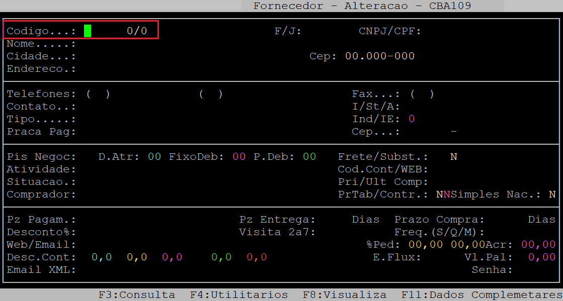 Ao acessar a rotina, no campo Codigo, informe o código do fornecedor desejado (com o dígito verificador), que esteja cadastrado no sistema e, pressione a tecla Enter para carregar seus dados.
