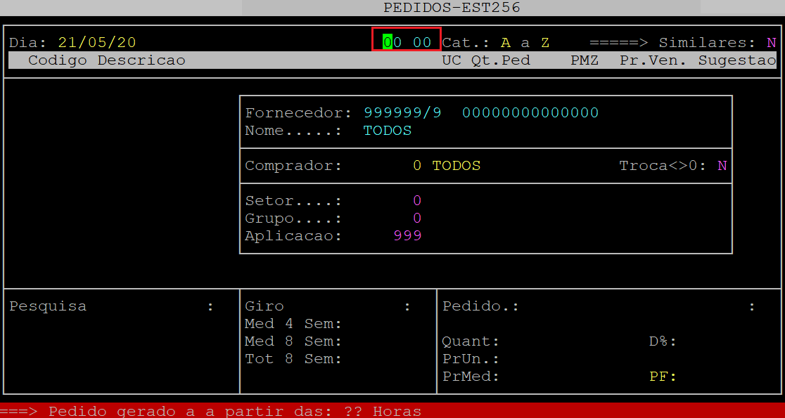 Nos campos 00 00, informe um horário desejado para filtrar os pedidos a partir de uma determinada hora, caso contrário, deixe os dois campos com 00 00 e pressione a tecla Enter para prosseguir.