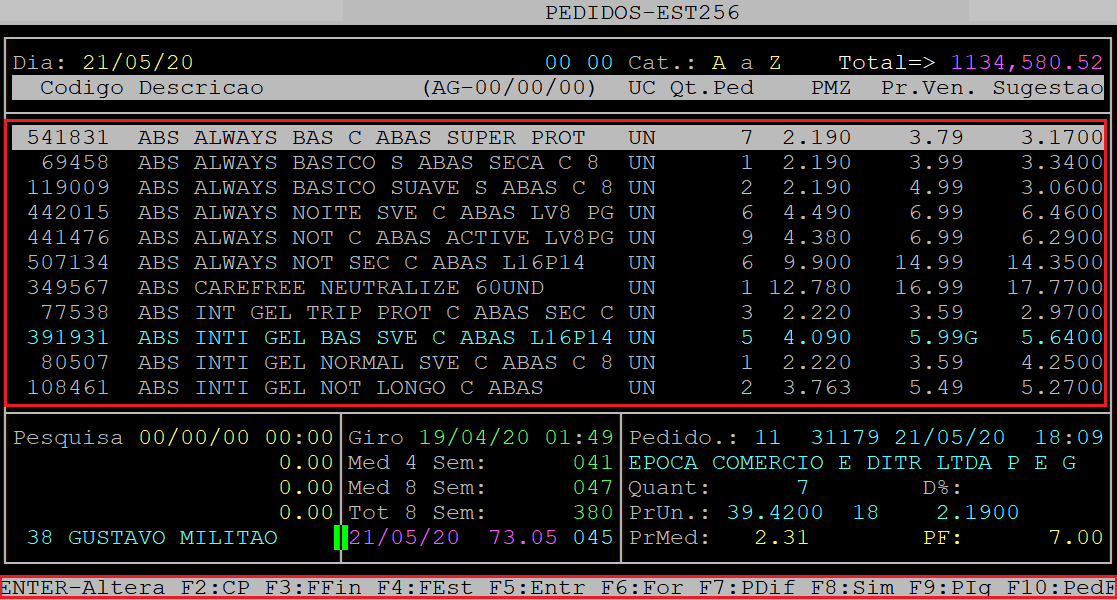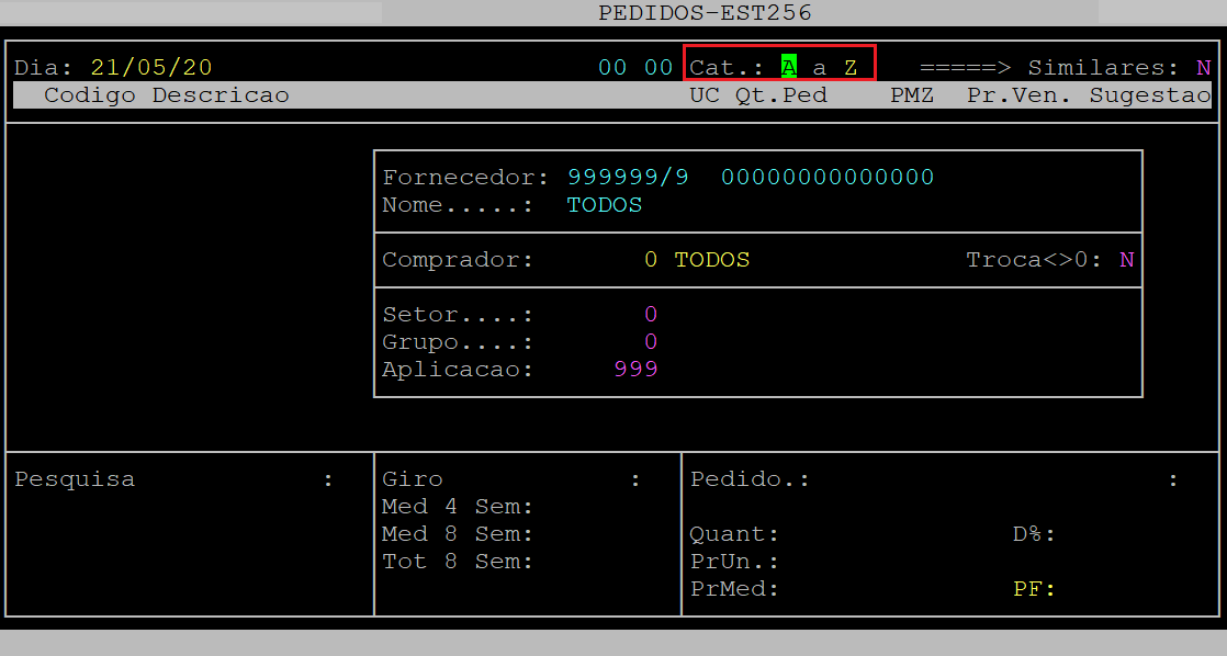 Nos campos Cat.: a, informe uma categoria desejada para filtrar os pedidos a partir de uma determinada categoria, caso contrário, deixe os dois campos com A a Z para considerar todas as categorias e, pressione a tecla Enter para prosseguir.