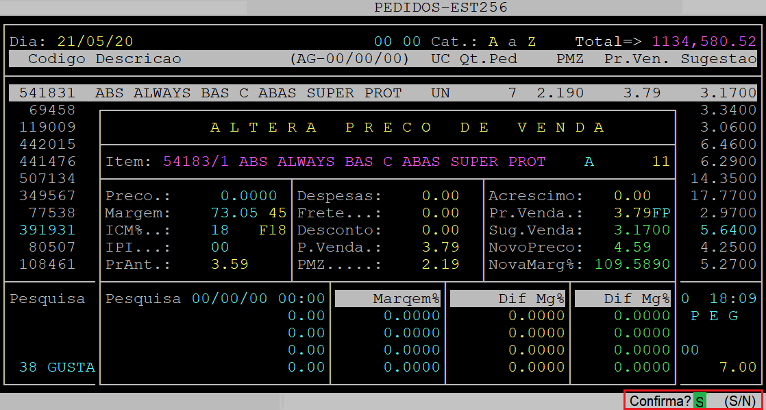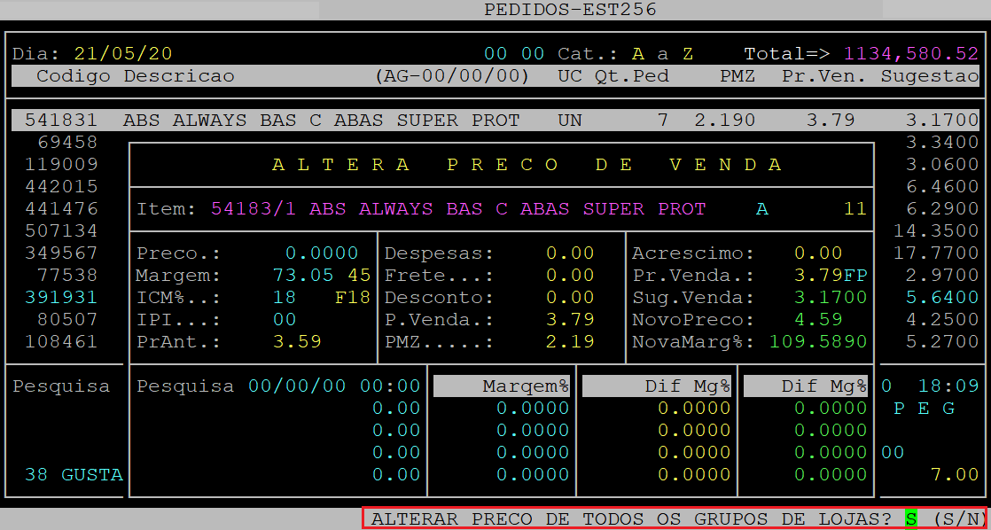 Logo após, o sistema exibirá a pergunta " ALTERAR PRECO DE TODOS OS GRUPOS DE LOJAS? ", no qual se utilizar várias lojas e desejar alterar o preço em todas deverá informar a letra S, ou a letra N para atualizar apenas a loja atual.