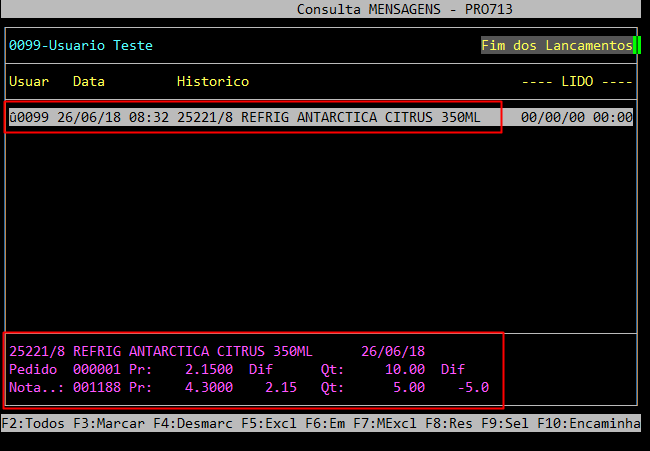 Localização: | Menu Principal (F6) / Mensagem - Usuário / Manutenção |