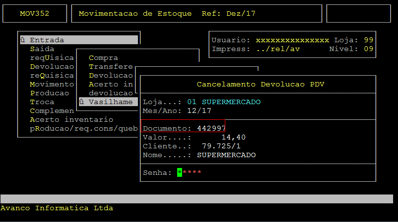 Localização: | Adm de Materiais / Gestão de Estoque / Gerenciamento Filial / Entradas e Saídas / Movimentação / Entrada / Vasilhame / Cancela Contra - Vale |