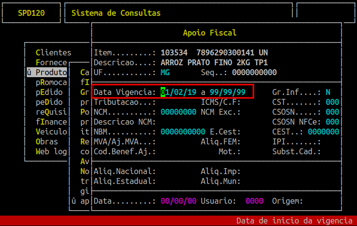 Em seguida, informe no campo Data Vigencia a data inicial e a data final e pressione a tecla Enter para carregar os dados do produto.