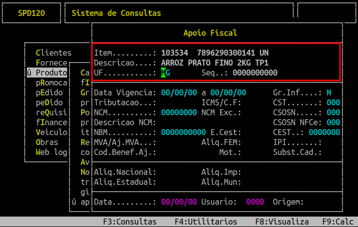 Ao acessar a rotina Apoio Fiscal, informe no campo Item o código interno do produto (com o dígito verificador) e pressione a tecla Enter. Se desejar informar a descrição do produto, pressione a tecla Enter ou a tecla F2 para visualizar as opções cadastradas no sistema, ou se desejar informar o EAN, pressione outro Enter.