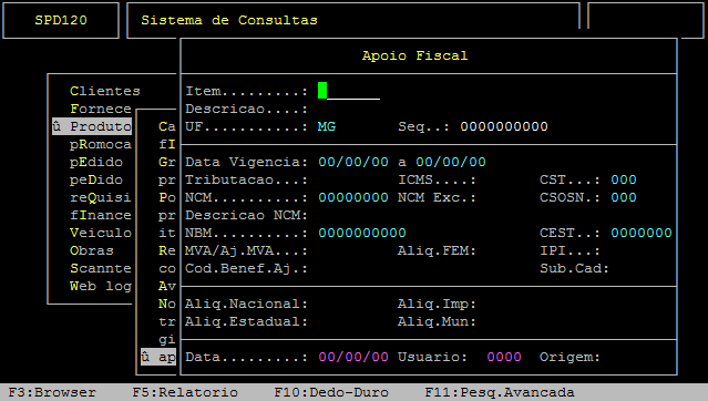 Localização: | (Menu Principal) F3 / Produtos / Apoio Fiscal |