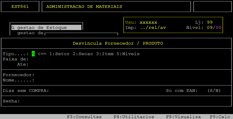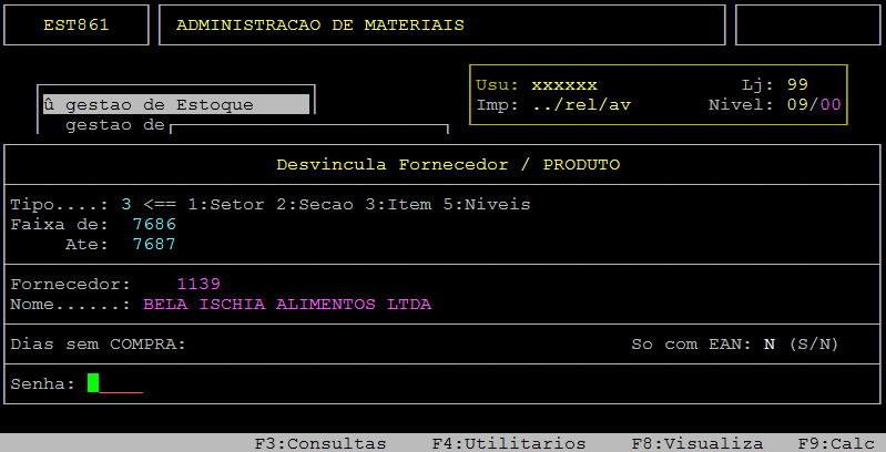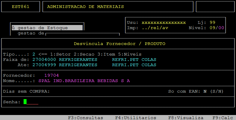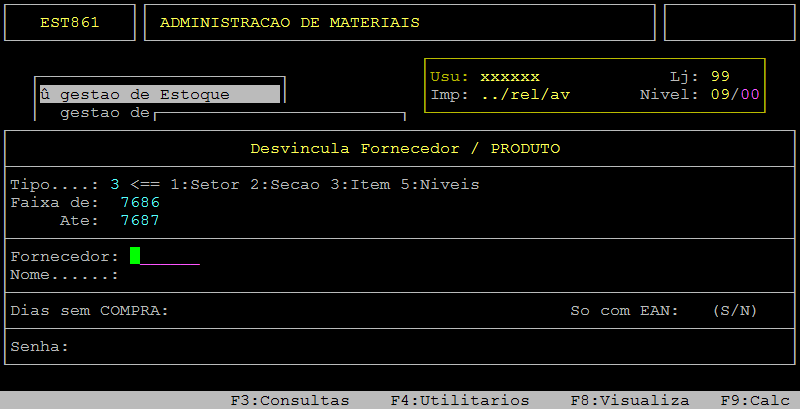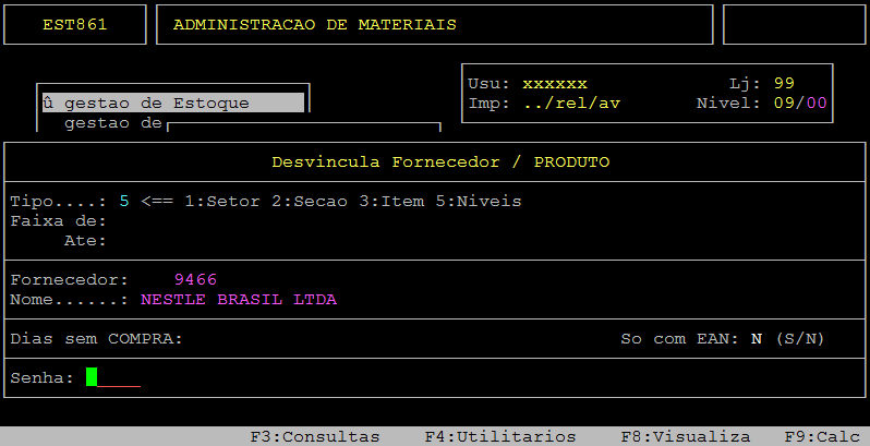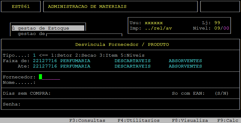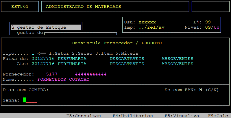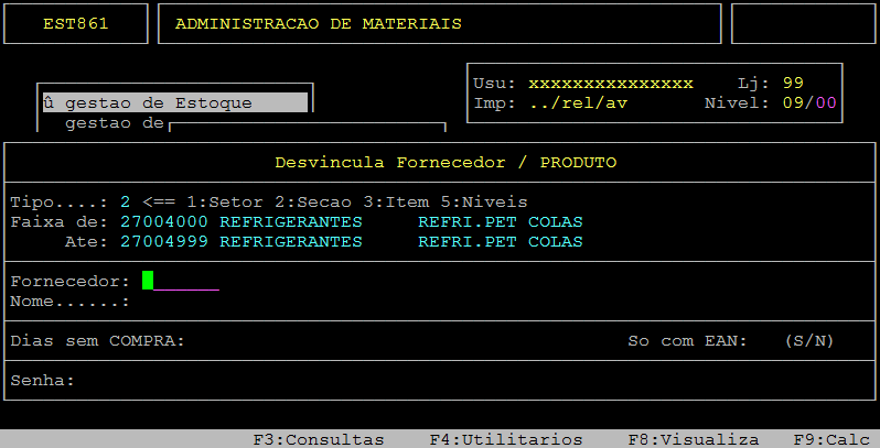 Em sequência, informe no campo Fornecedor o código do fornecedor, preencha os demais campos desejados, digite a senha e pressione a tecla Enter ou S para confirmar a desvinculação.