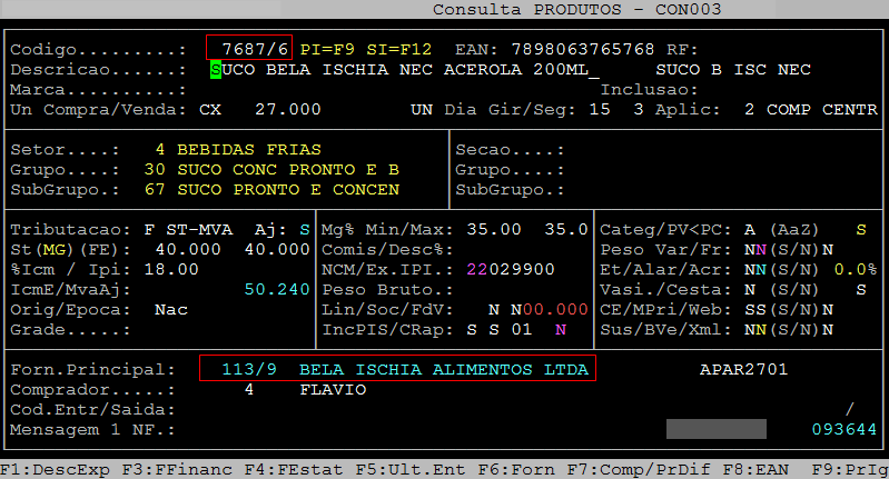 Abaixo, seguem dois exemplos de itens com o mesmo fornecedor, sendo ele o 113/9 (caminho: F3 / Produtos / Cadastro).