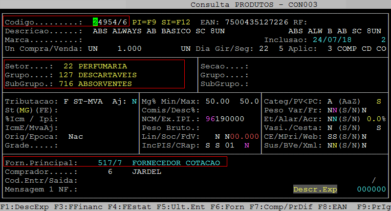 Abaixo segue um exemplo de um item classificado por setor, o produto 24954/6, cujo fornecedor principal é o 517/7 (caminho: F3 / Produtos / Cadastro).