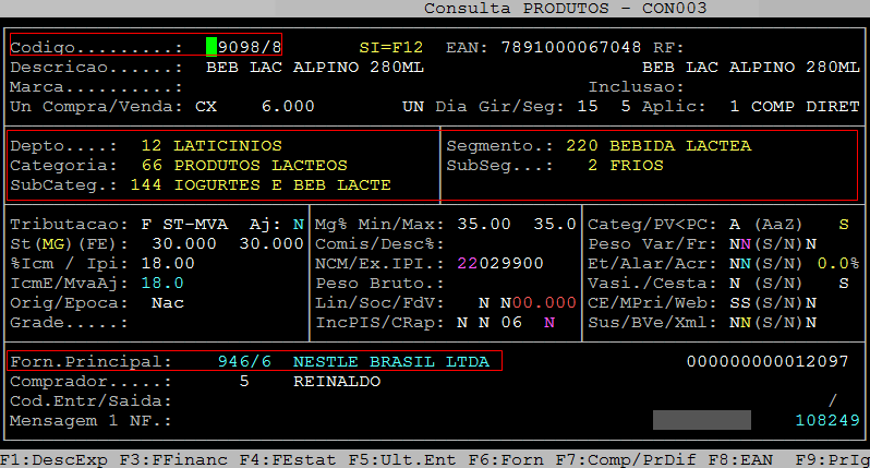 Abaixo segue um exemplo de um item classificado por departamento, o produto 9098/8, cujo fornecedor principal é o 946/6 (caminho: F3 / Produtos / Cadastro).