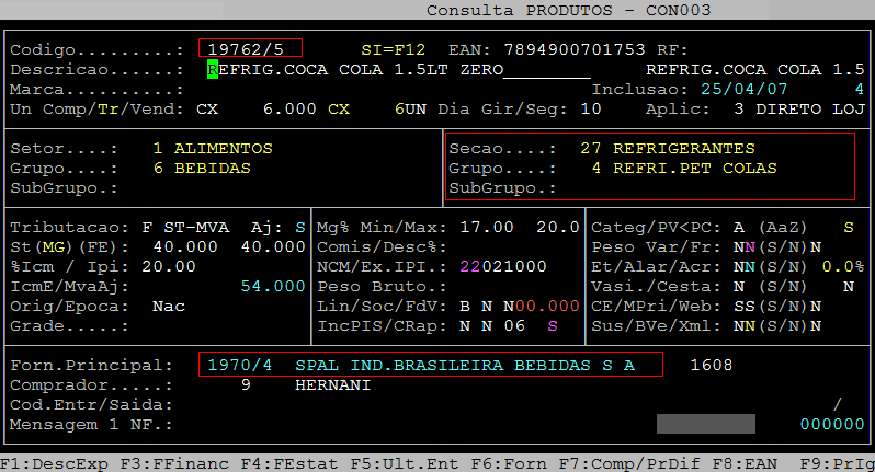 Abaixo segue um exemplo de um item classificado por seção, o produto 19762/5, cujo fornecedor principal é o 1970/4 (caminho: F3 / Produtos / Cadastro).