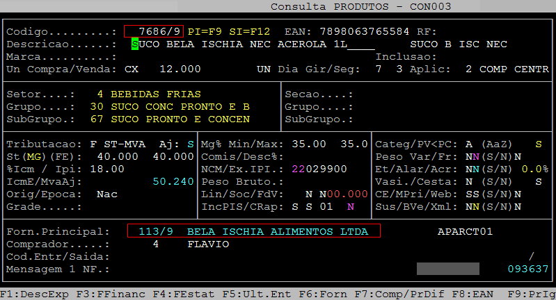 Exemplo da Tela do Produto 7686/9 com Fornecedor Principal 113/9