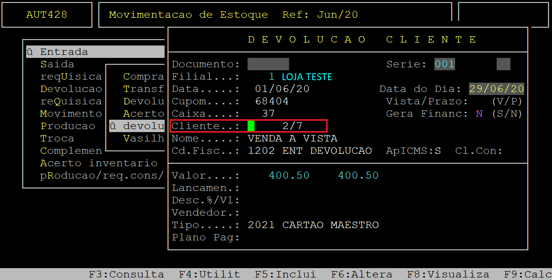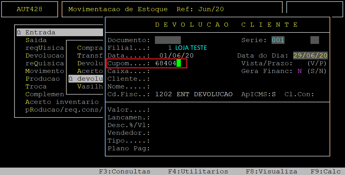 No campo Cupom, informe o cupom, no qual deseja realizar a devolução e, pressione a tecla Enter para prosseguir.