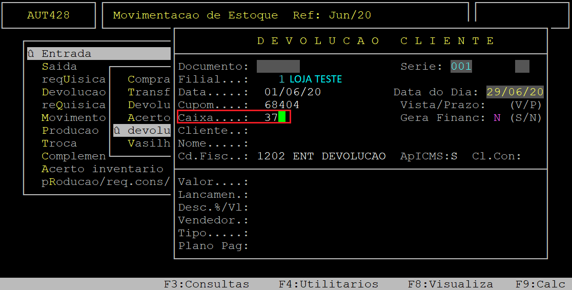 No campo Caixa, informe o caixa referente ao cupom que deseja realizar a devolução e, pressione a tecla Enter para prosseguir.