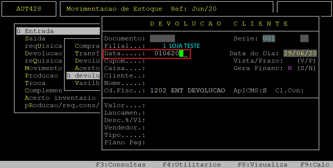No campo Data, informe a data referente ao cupom que deseja realizar a devolução e, pressione a tecla Enter para prosseguir.