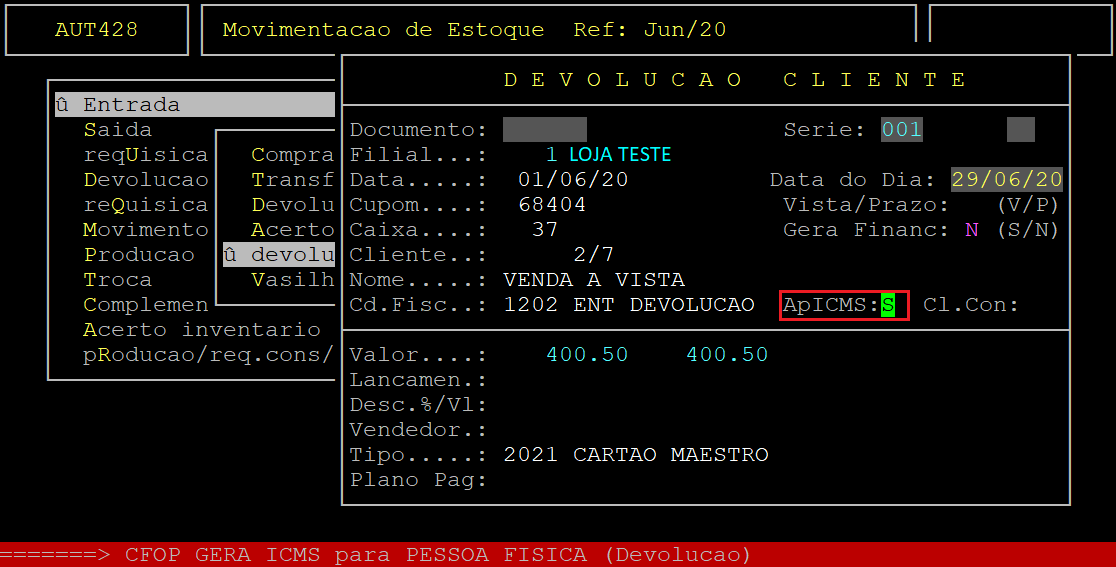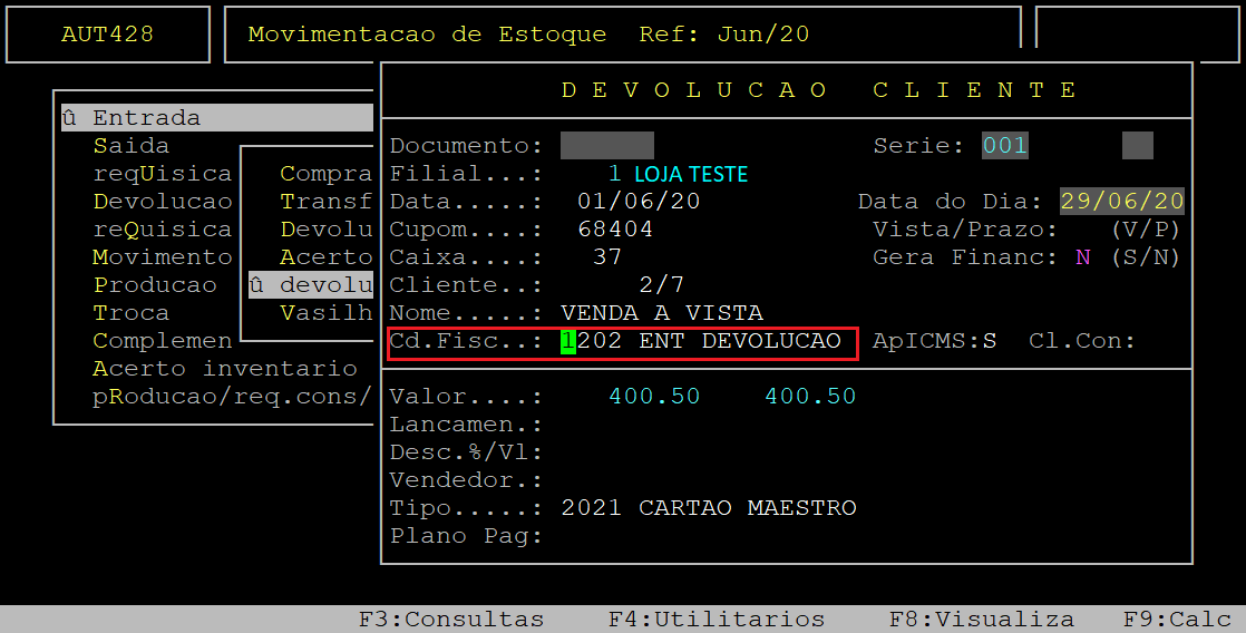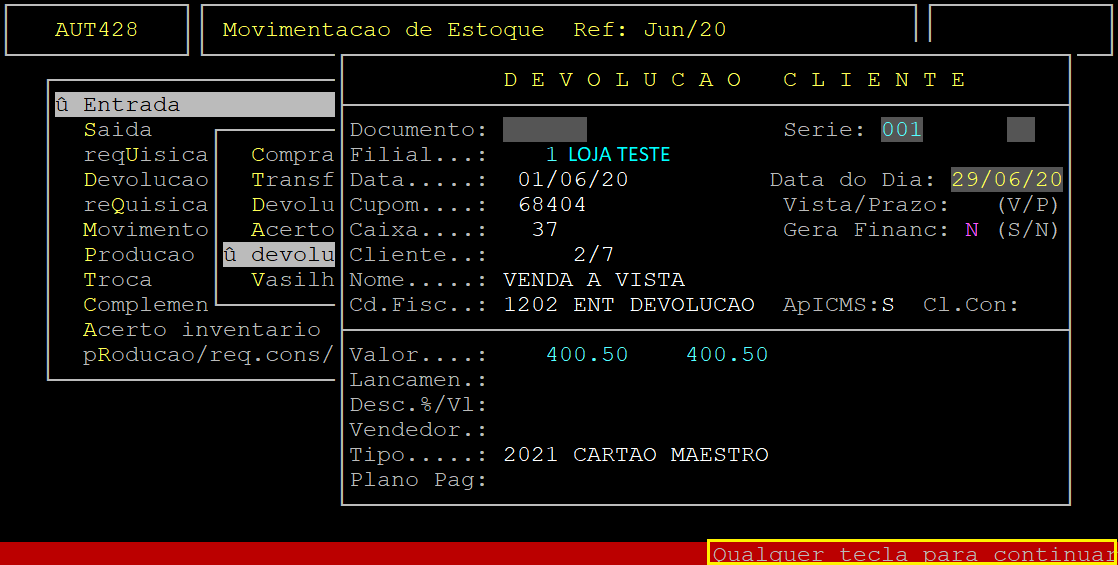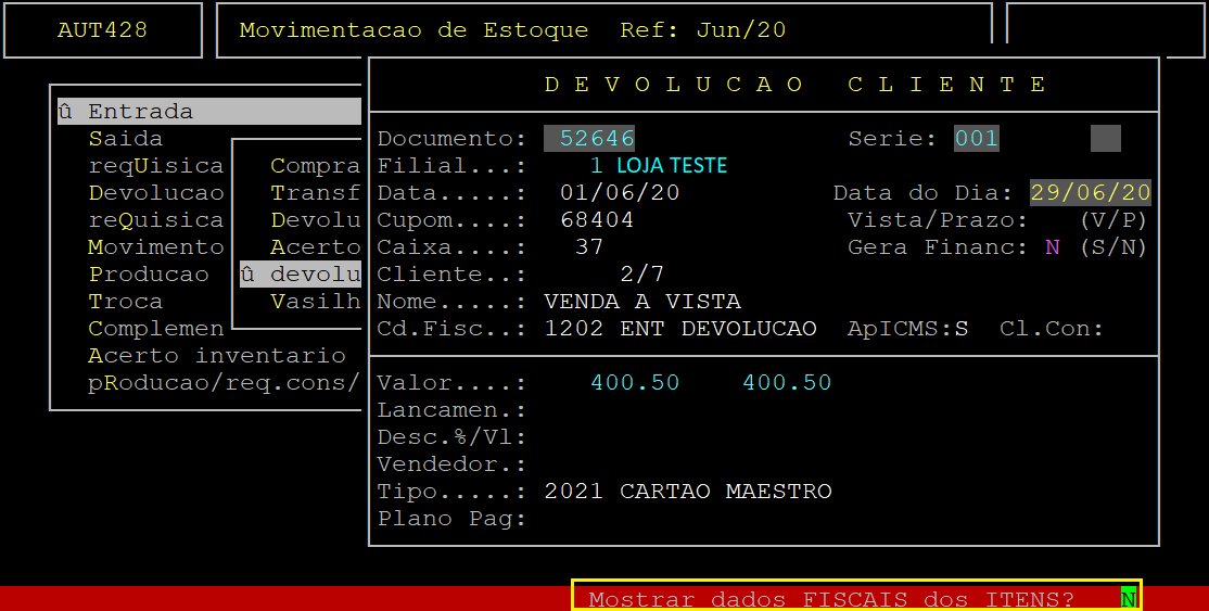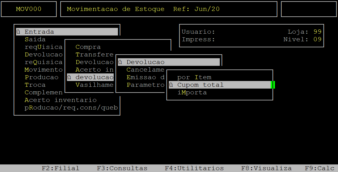 Localização: | Administracao Materiais / Gestão de Estoque / Gerenciamento Filial / Entradas e Saidas / Movimentacao / Entrada / Devolucao PDV / Devolucao / Cupom Total |