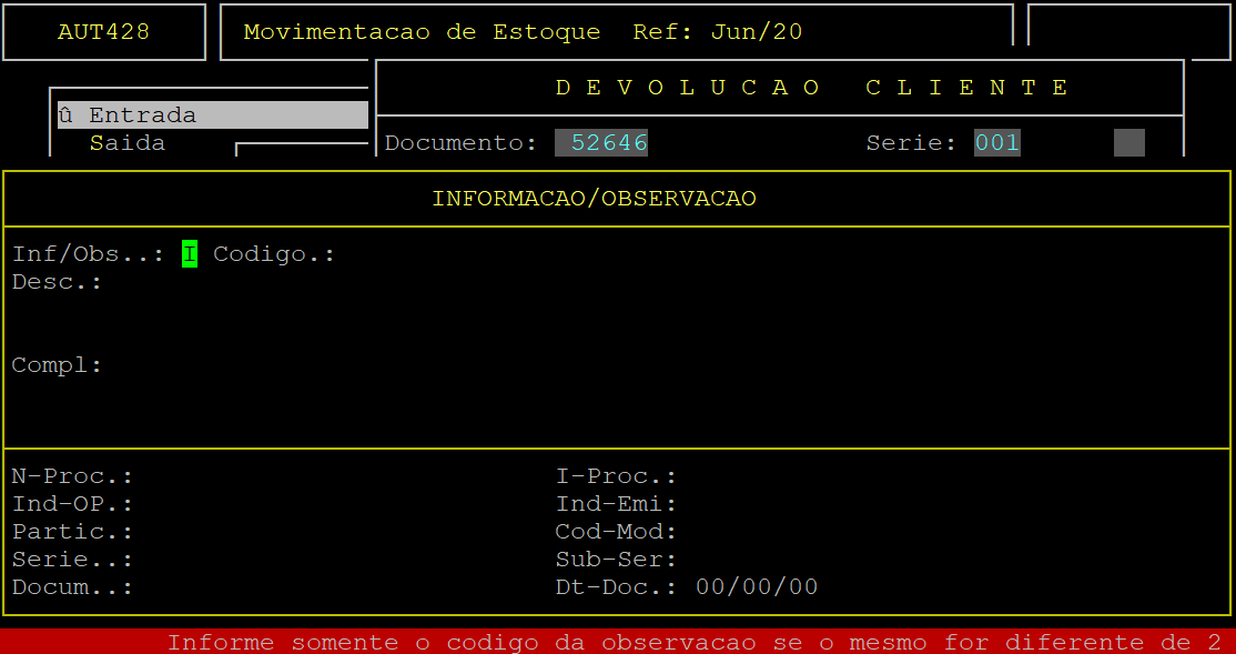 Ao acessar a tela INFORMACAO/ OBSERVACAO, insira as informações e observações, se desejar e, pressione a tecla Esc para finalizar.