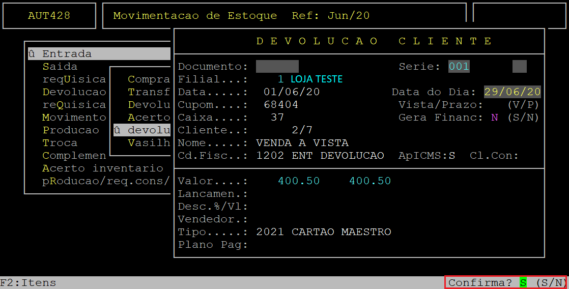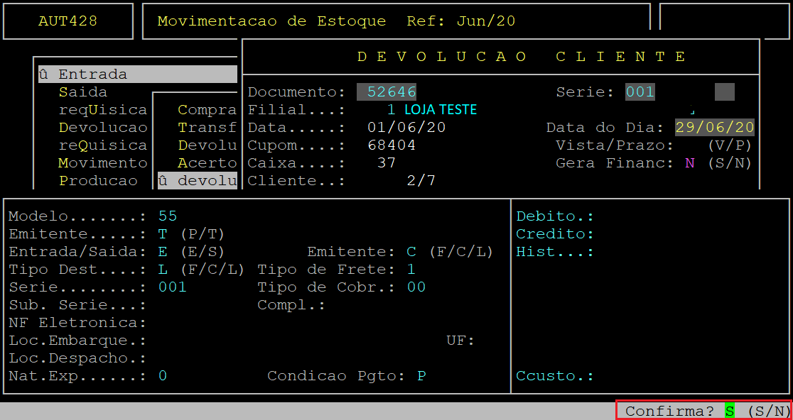 Em seguida o sistema exibirá a pergunta " Confirma? ", no qual deverá pressionar a tecla Enter ou S para confirmar os dados do cupom que deseja realizar a devolução.