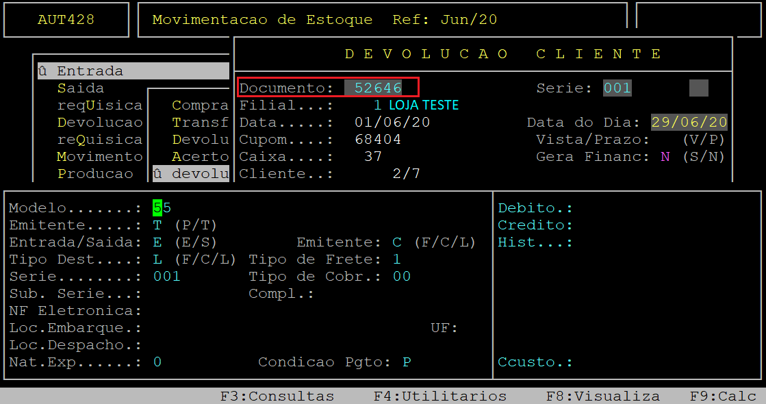 Neste momento o sistema exibirá o número da devolução no campo Documento.