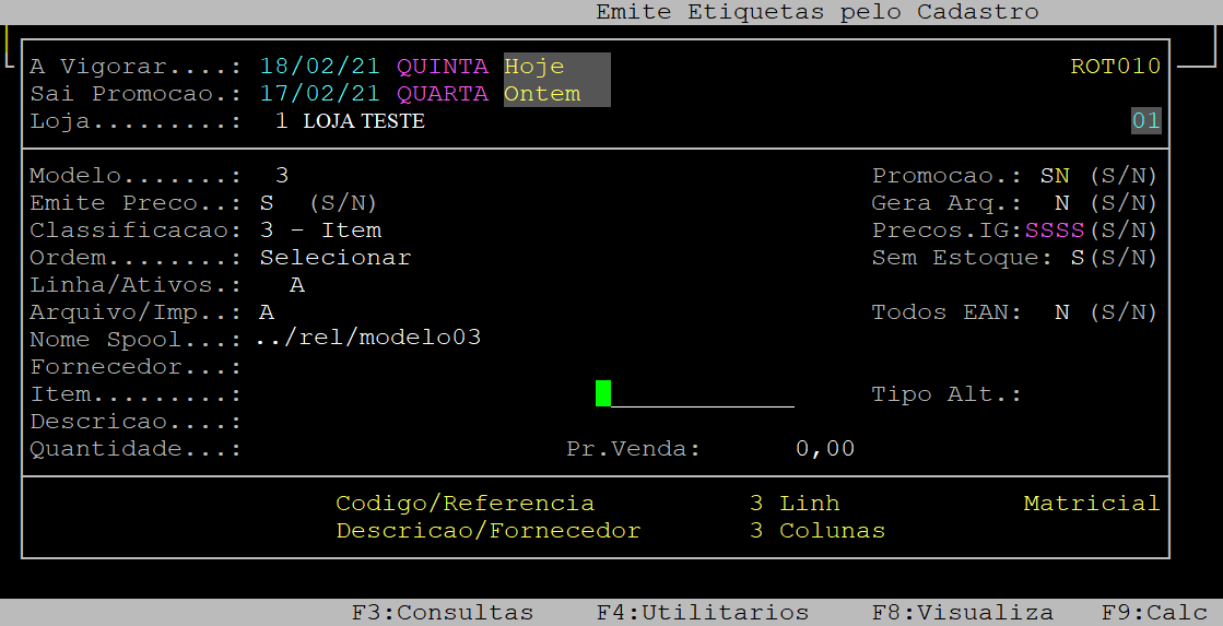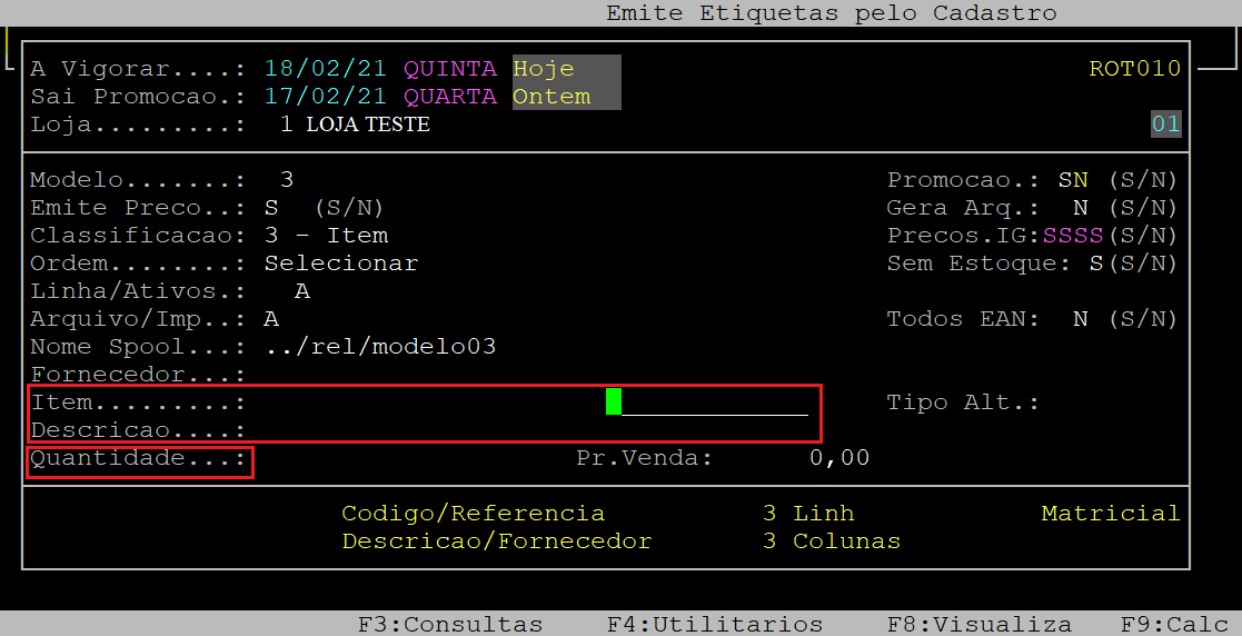 Emite Preco: | Utilize a seta do teclado para cima para alcançar esse campo. Com o cursor posicionado no campo, informe a letra S para emitir o preço na etiqueta, ou N para não emitir. |