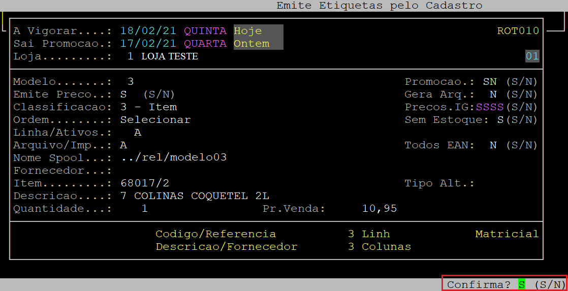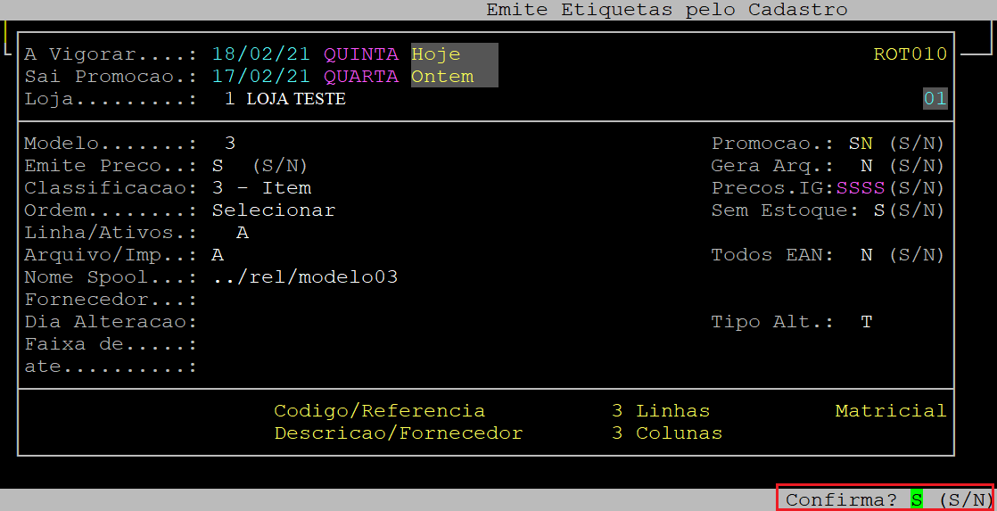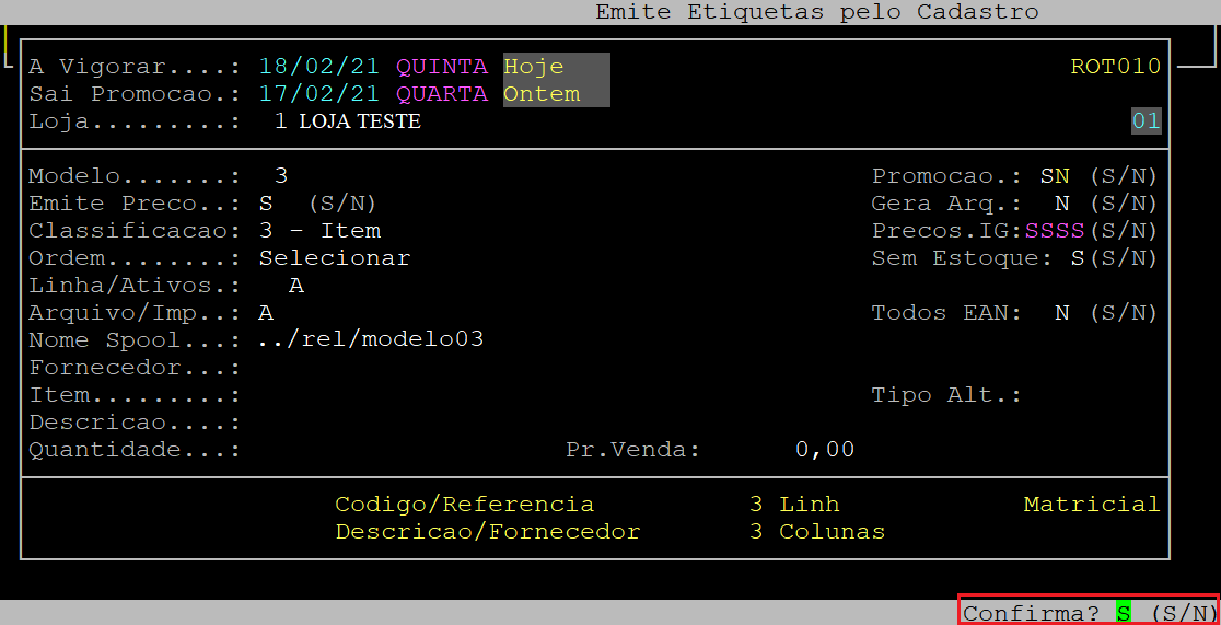 Em sequência, o sistema abrirá a tela de configuração da etiqueta, no qual deverá preencher os campos desejados ou apertar a tecla Enter para percorrer os campos e manter os dados padrão. Ao ser exibida a pergunta " Confirma? ", aperte a tecla Enter ou S para confirmar.