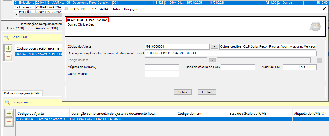 Após emissão da nota fiscal, deverá ser criado um ajuste para o registro C197.
