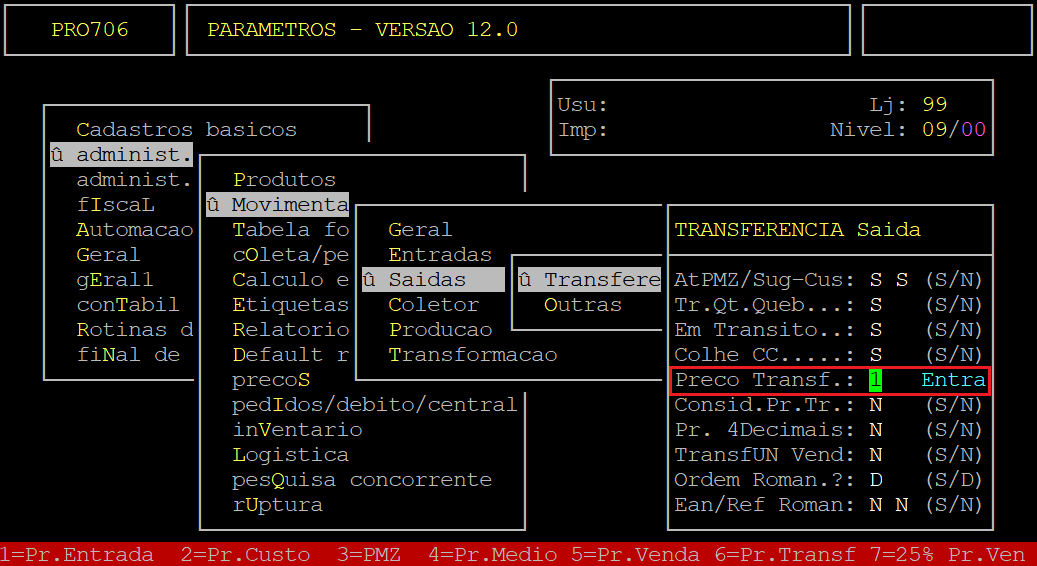 Em seguida, pressione a tecla Enter até alcançar o campo Preco Transf e, em sequência informe o número correspondente ao preço desejado para realizar as transferências, sendo: 1 - preço de entrada, 2 - preço de custo, 3 - PMZ, 4 - preço médio, 5 - preço de venda, 6 - preço de transferência, 7 - 25% do preço de venda.