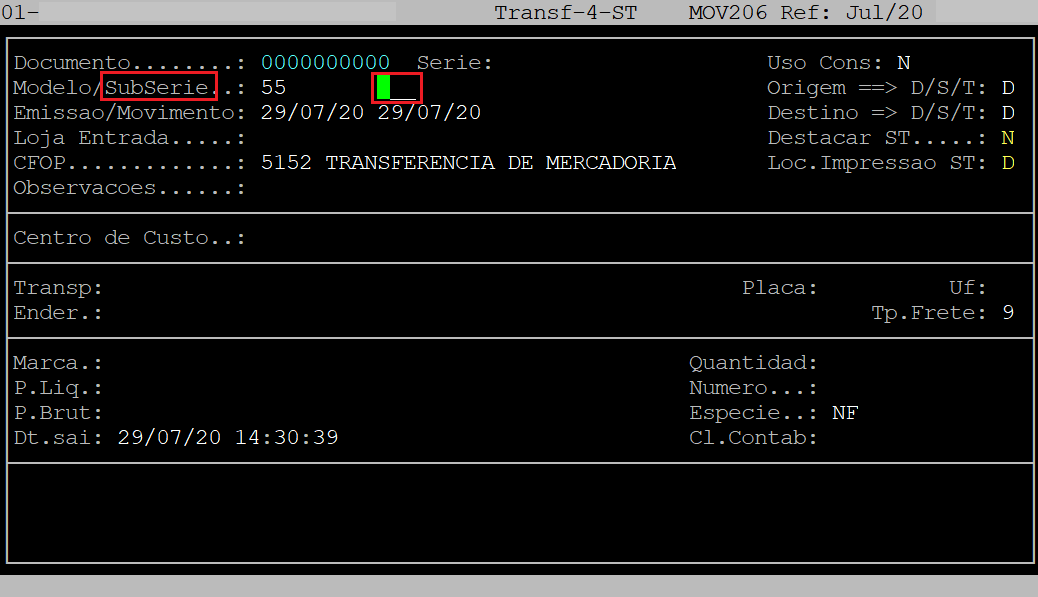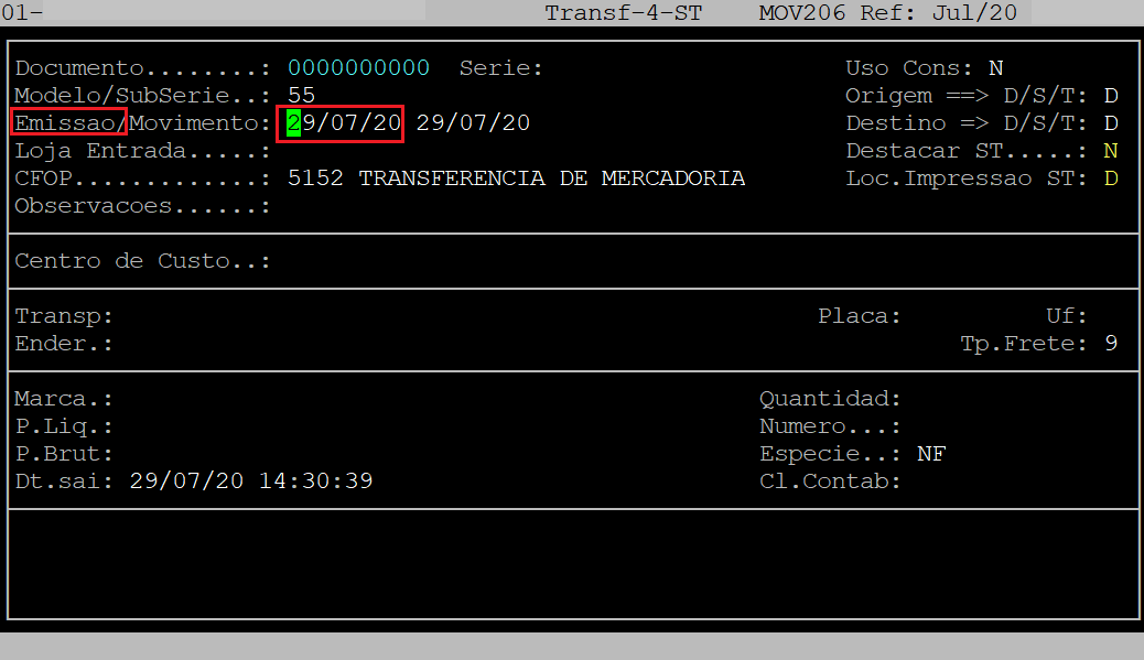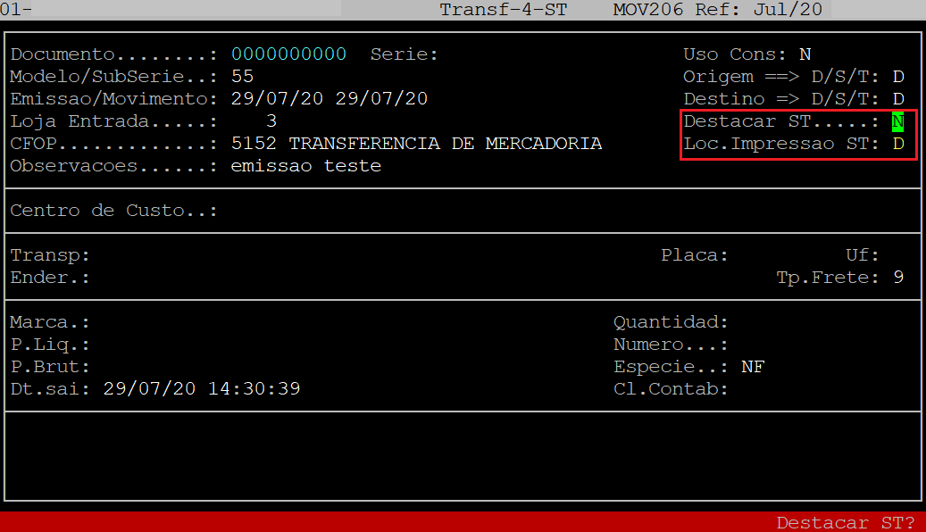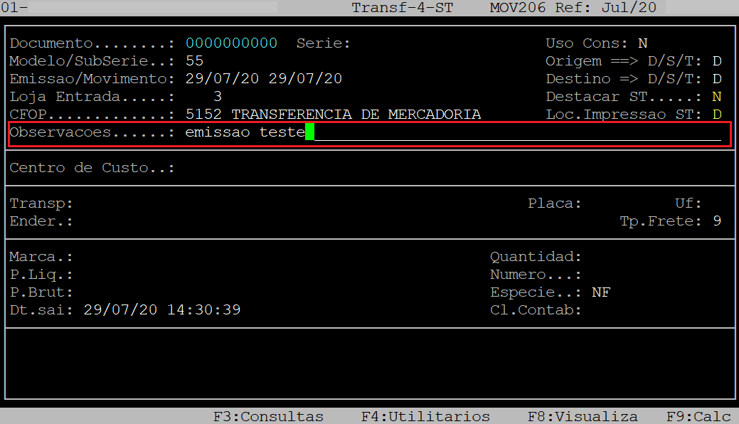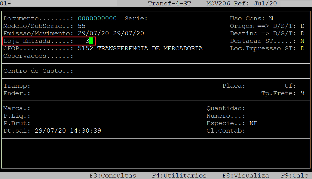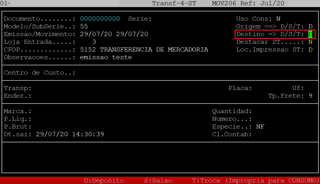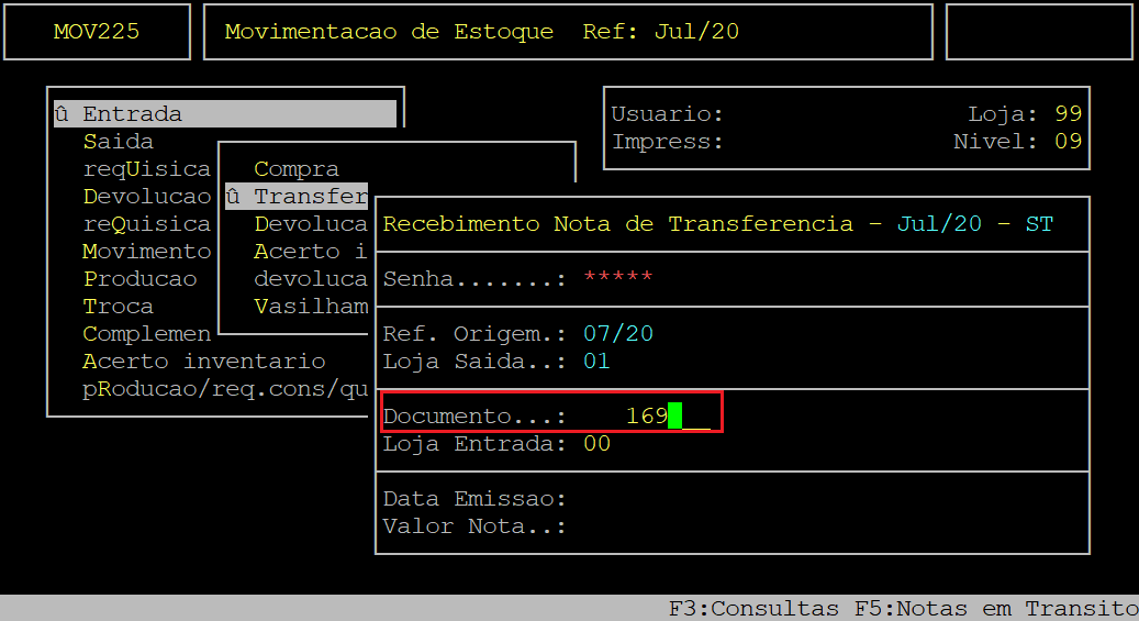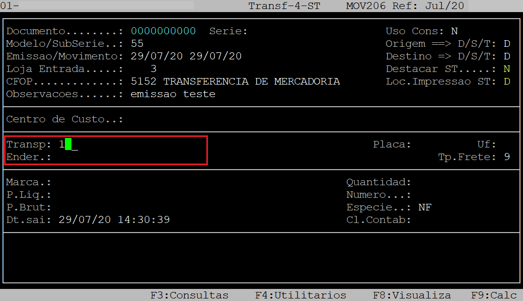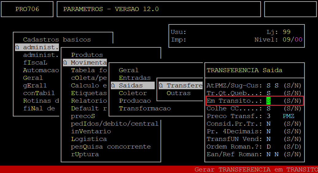 Ao acessar a rotina, pressione a tecla Enter até alcançar o campo Em Transito e, em seguida informe a letra S para configurar a nota de transferência para trânsito.